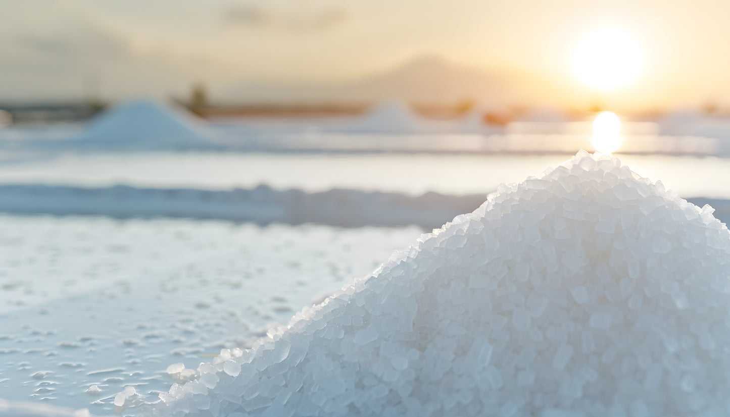 Concentrated brine yields natural sea salt crystals hand-raked and harvested